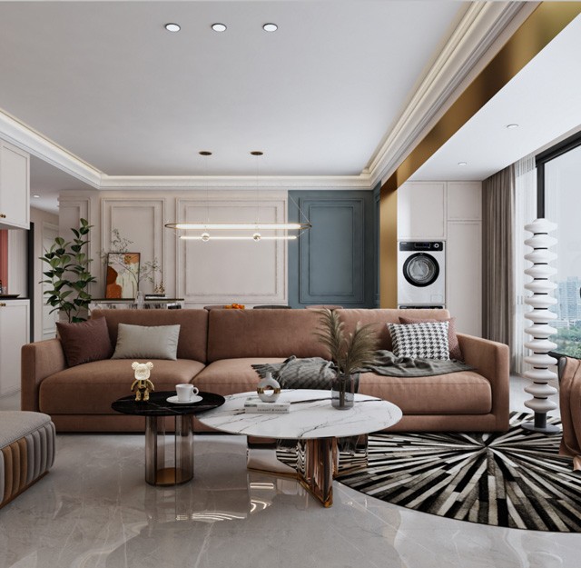 科技布、石材、黄铜、皮革、长虹玻璃的材质都是轻奢不可缺少的要素,PU线条、造型门板营造法式氛围