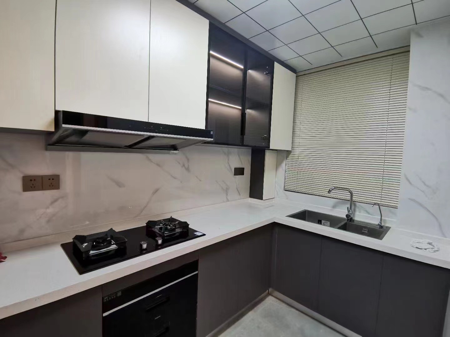 厨房的地柜和吊柜采用了两种颜色,避免了单调,玻璃门和灯带的设计又增添了几色彩
