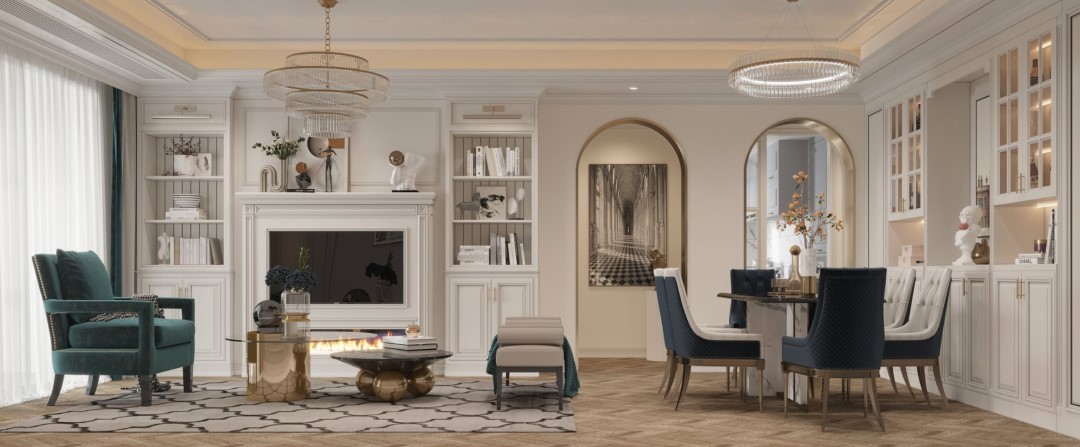 奶油色和墨绿点缀,奠定空间温柔浪漫基调。墙面上的PU线条和角线装饰,则是提升空间精致度的关键一笔,美式氛围感信手拈来。