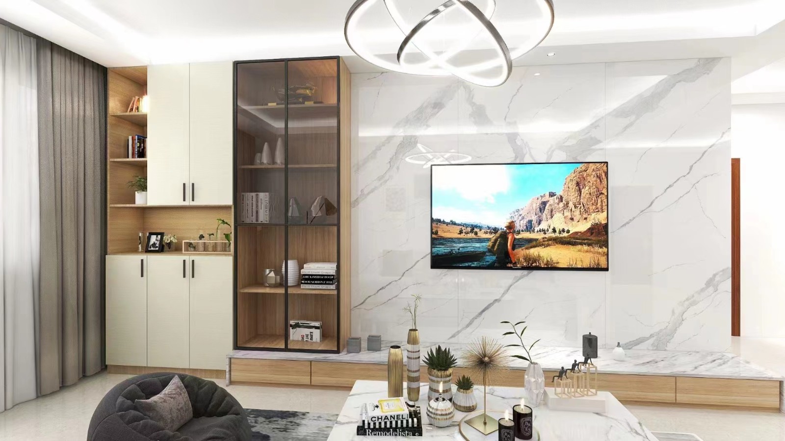 原木风电视背景墙配上玻璃门,不一样的气息体现