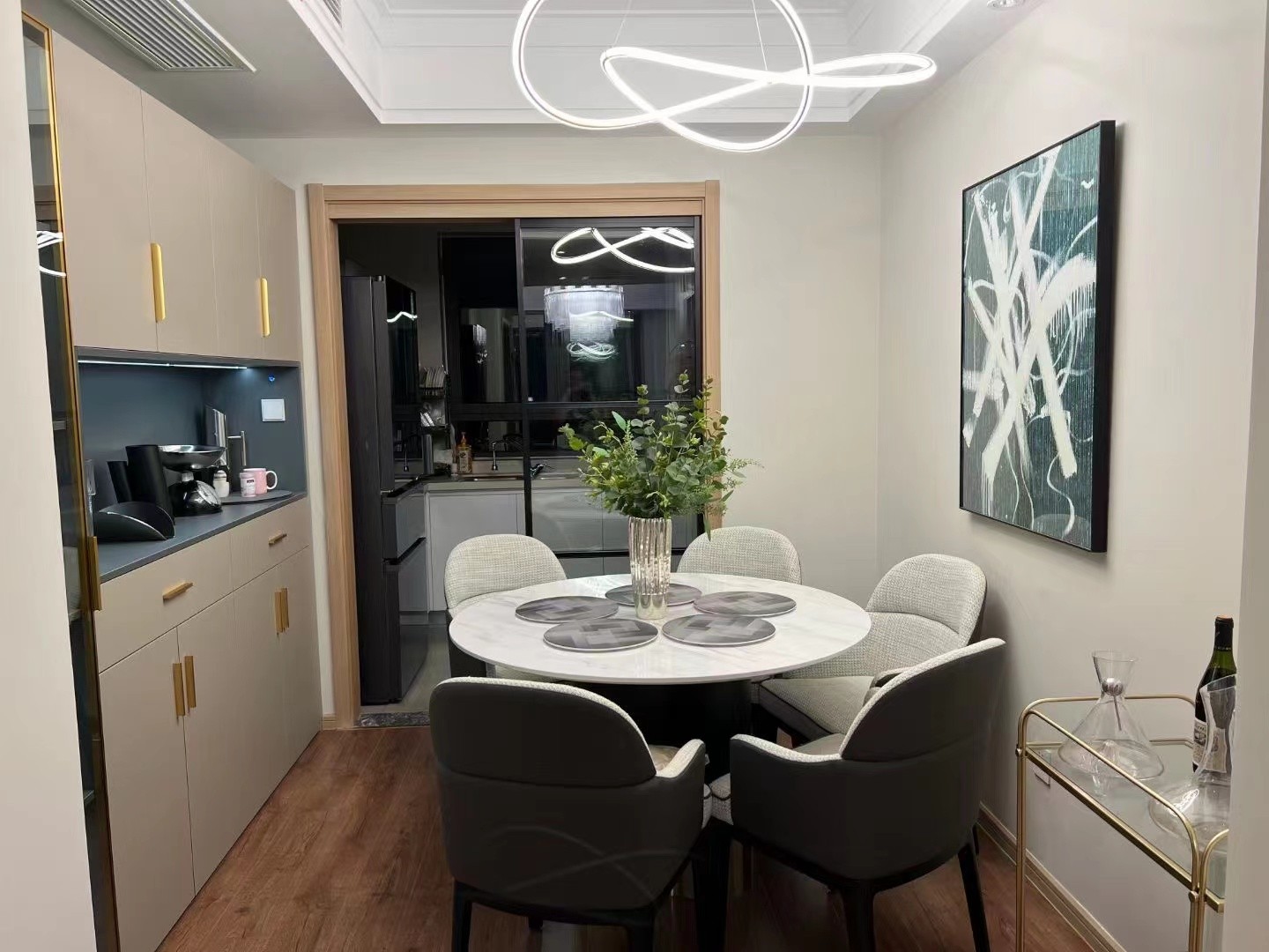客厅定制式餐变柜,肤感门板,金色拉手,独具轻奢气息