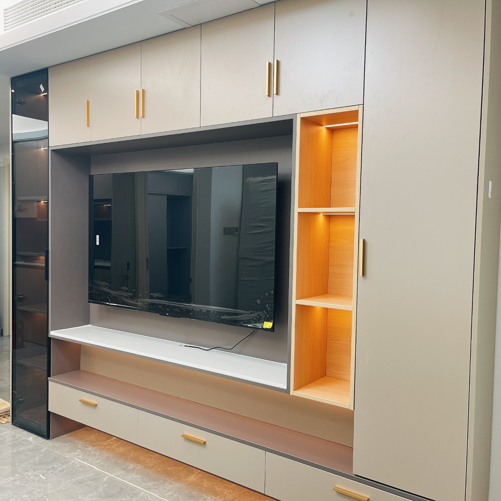 客人背景墙定制,玻璃门搭肤感门搭爱马仕橙套色格
