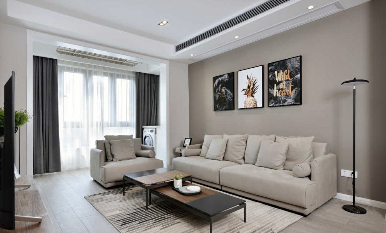 两张错落有致的深色原木纹理小茶几,和相同材质的电视柜中和了灰色调的冷清,为空间带来了温暖。