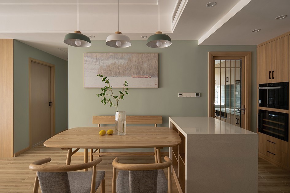 绿色瓷砖与原木色橱柜搭配,使得厨房空间干净明亮,清新自然