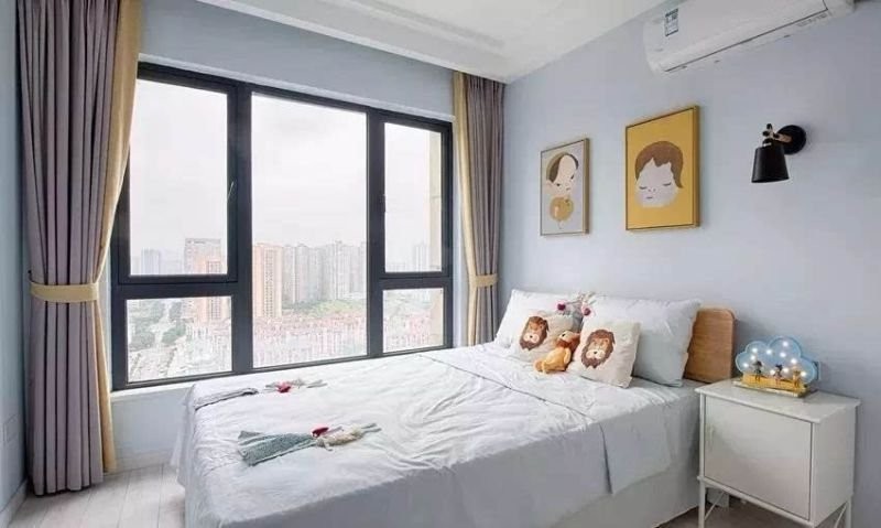 为将来的宝宝预设的卧室,浅木色地板,蓝灰色系结合明黄的点缀,不仅天真可爱,而且男女宝宝都适用