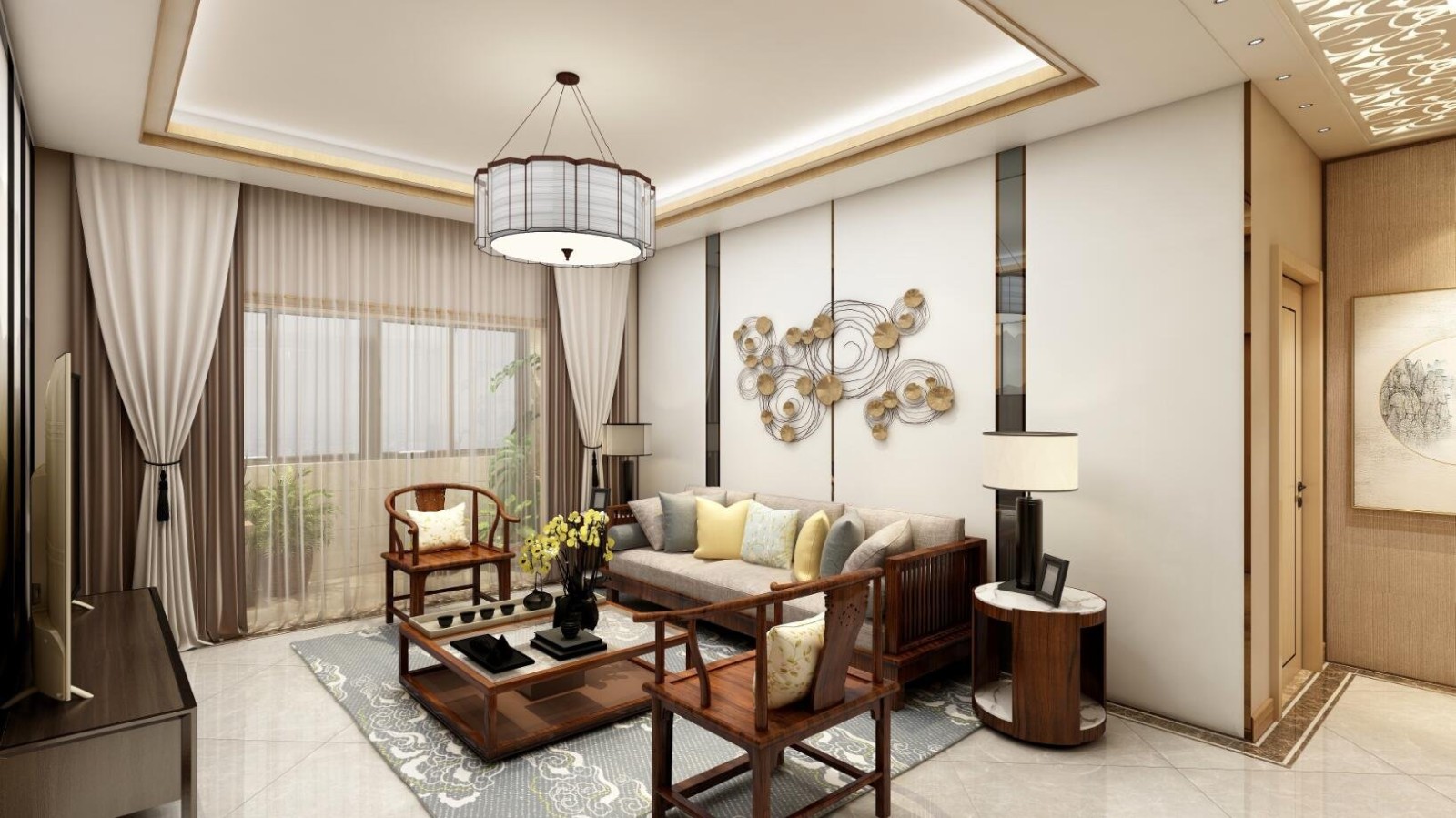 客厅:新中式风格的客厅设计,整体清新色调,宽敞明亮设计