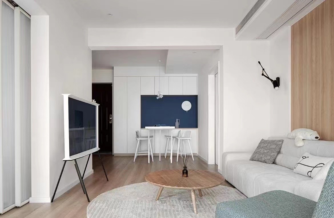 客厅以白色和原木色为基调,配上灰色主沙发,营造出一种简洁、干净、纯粹的本真空间,演绎不一样的故事和情感。