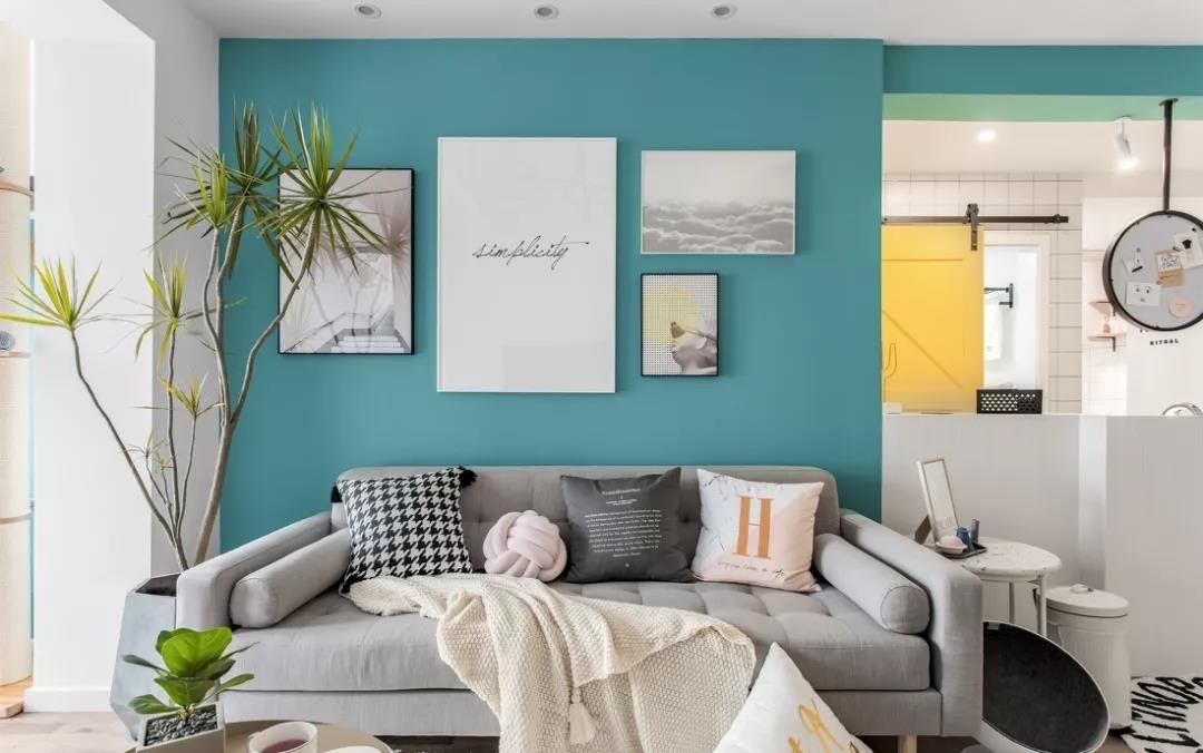 客厅蓝绿色调的背景墙十分抢眼,让整个屋子都洋溢着青春靓丽的气息,各种绿植也点缀其中,活力满满。阳台融入客厅,会让空间更显视野开阔,住得人也更舒心自在。