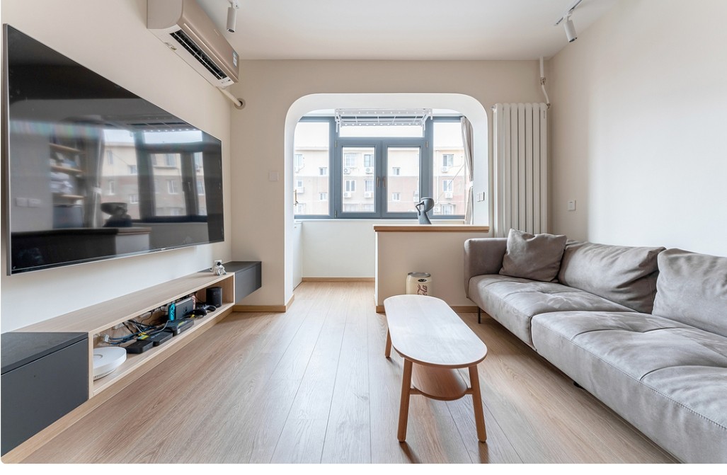 客厅以白色为主基调,辅以原木色做点缀。木地板通铺到阳台,有效提升了空间的延展性。 悬浮式的电视柜,轻盈不占空间,还很方便搭理,清洁一扫而光