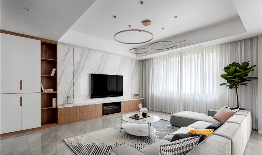 电视背景墙的金色线条配合黑色玻璃的柜门作为点缀,硬朗通透的大理石搭配木质的定制家具,一刚一柔,平衡整个空间。