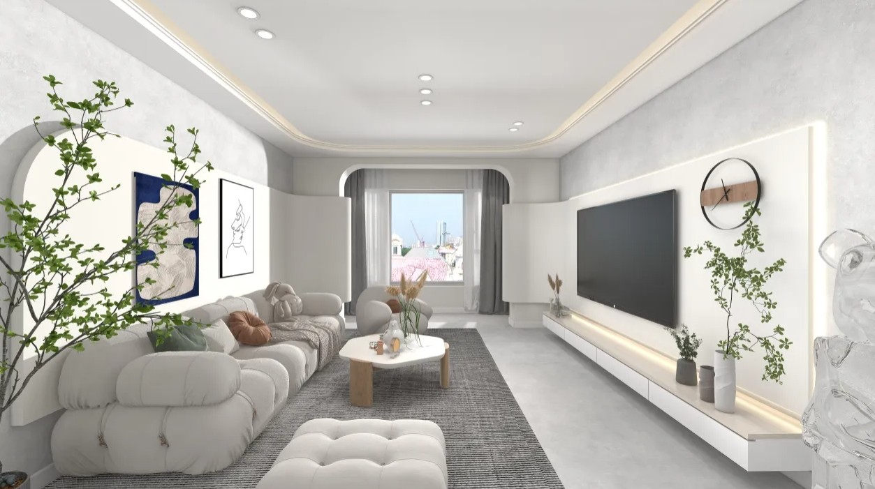 客厅使用浅灰色搭配白色设计。