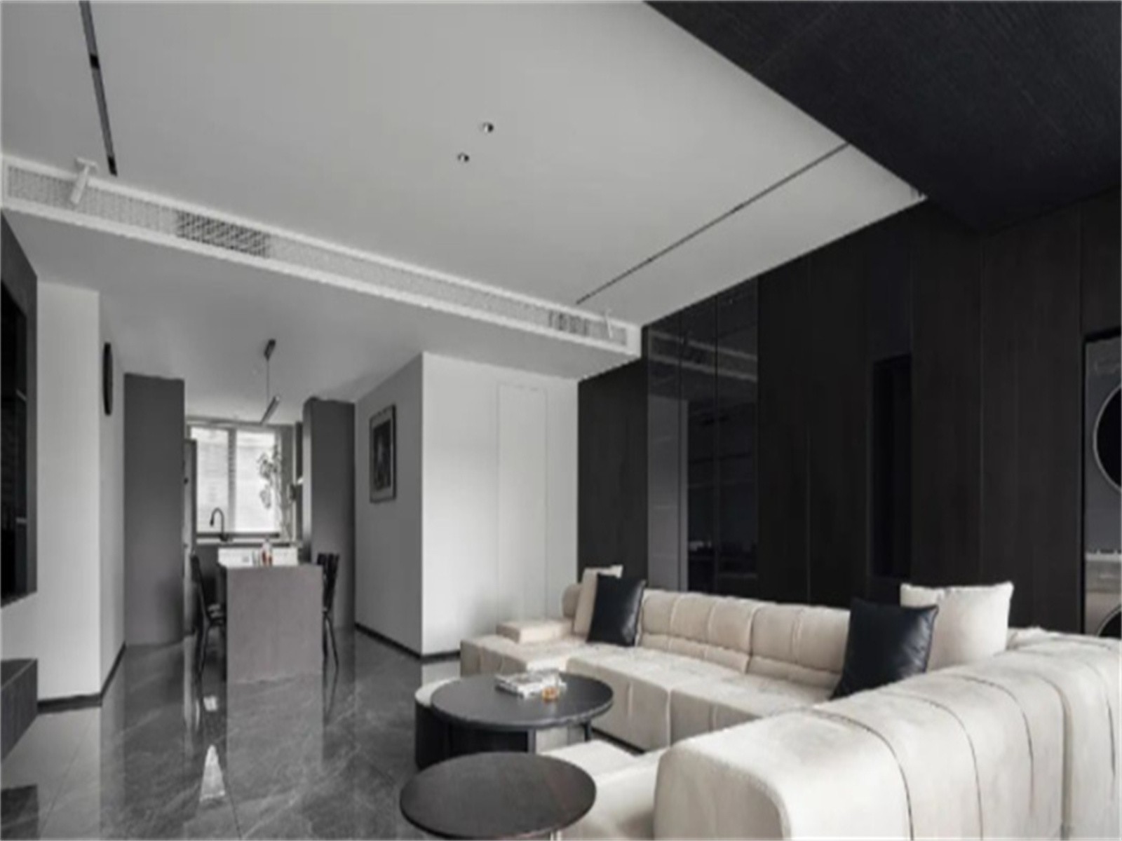 客厅,地面通铺灰系大理石纹地砖,顶面无主灯设计,整个空间以极简经典的取色让格调变得***大气