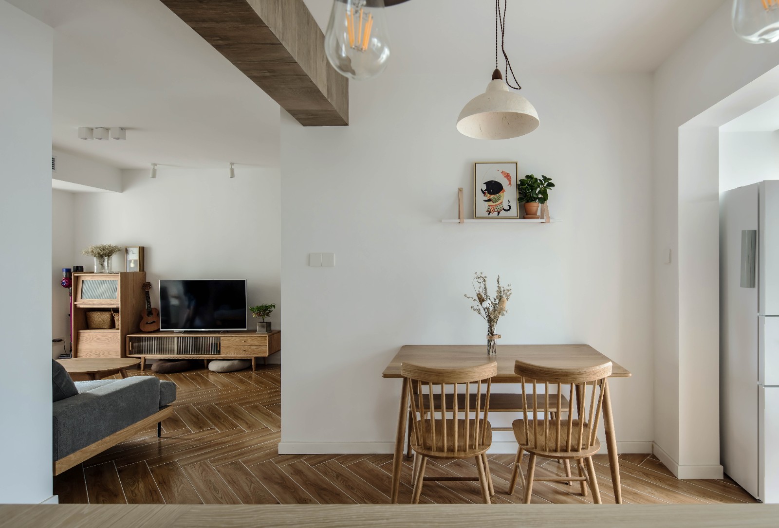 灰色棉麻布料质感的宽大沙发、清新淡雅的绿色挂画配上绿植;日式电视柜、日式的抽屉收纳柜勾勒出电视背景墙,去掉繁琐的材质堆叠,以最原始而质朴的方式呈现;
