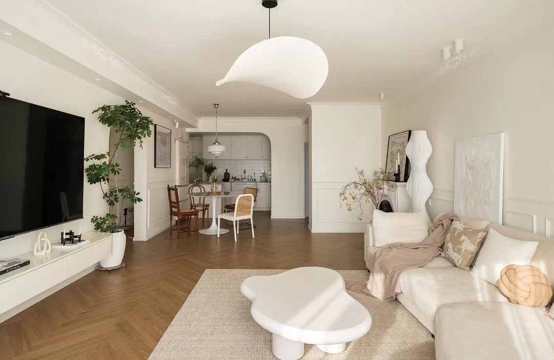 客餐厅选择了奶油色通刷和木纹砖通铺的方式,整体更统一完整,淡淡的暖色调营造温馨柔和的空间底色。