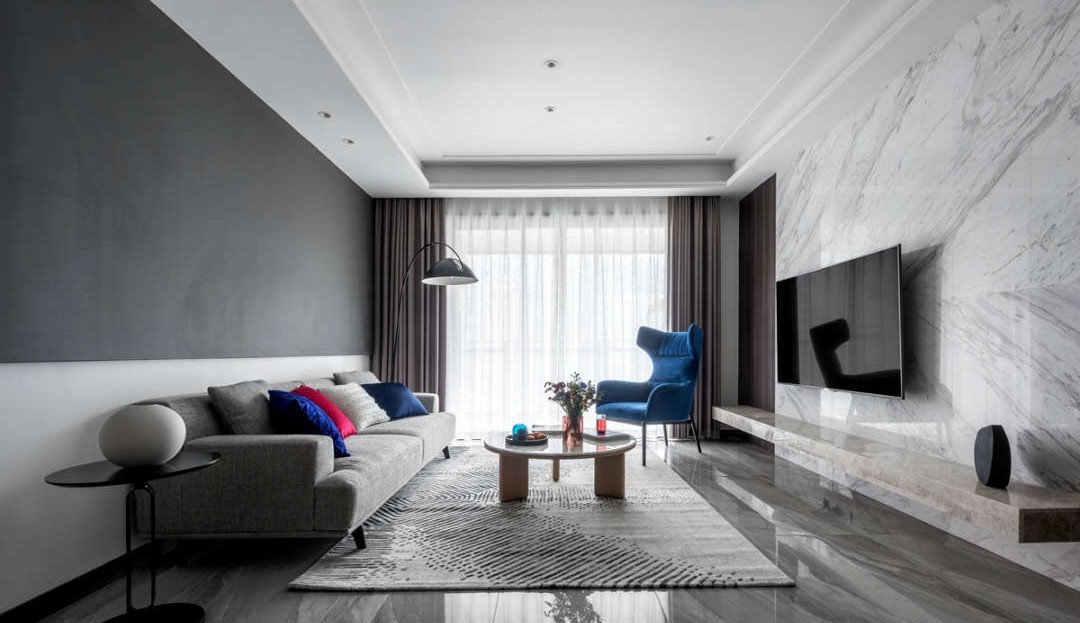 电视墙利用黄金分割法手法设计,左边为深色饰面板,右边爵士白大理石,中间悬空台面采用灰色大理石分割。