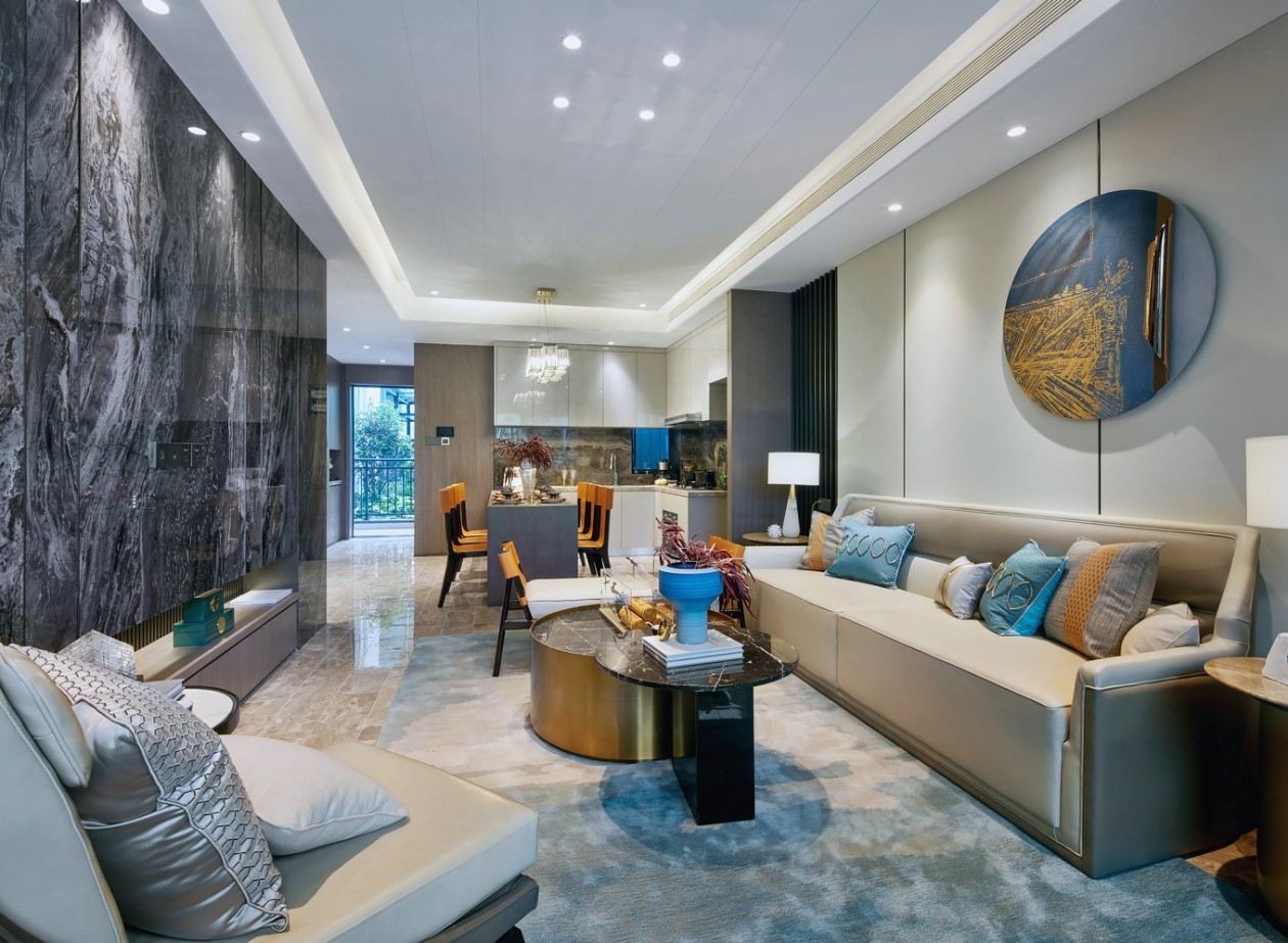 沉静感的深灰大理石作为空间的电视墙背景,流溢出新奇而前卫的艺术气息。简约而凝练的东方元素,肆意糅合于室内各处,构出冷静非凡的气质,带来多重感官体验。