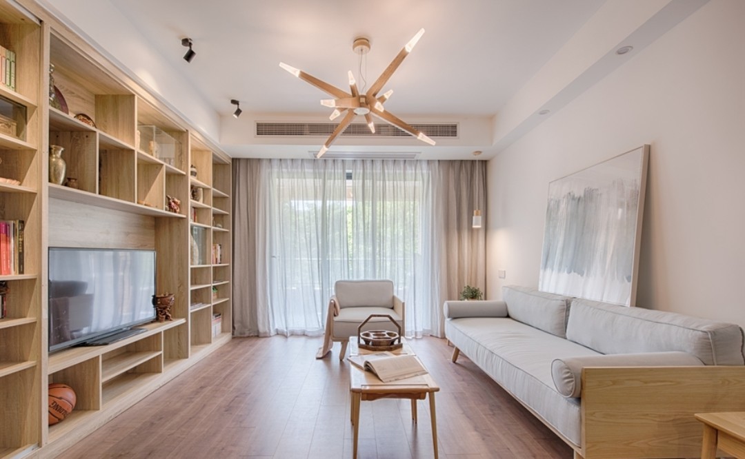 采用原木色调的家具搭配深色的地板,主体色彩将以白色为基色,搭配原木家具,少量灰色点缀营造原木情节的岁月静好。