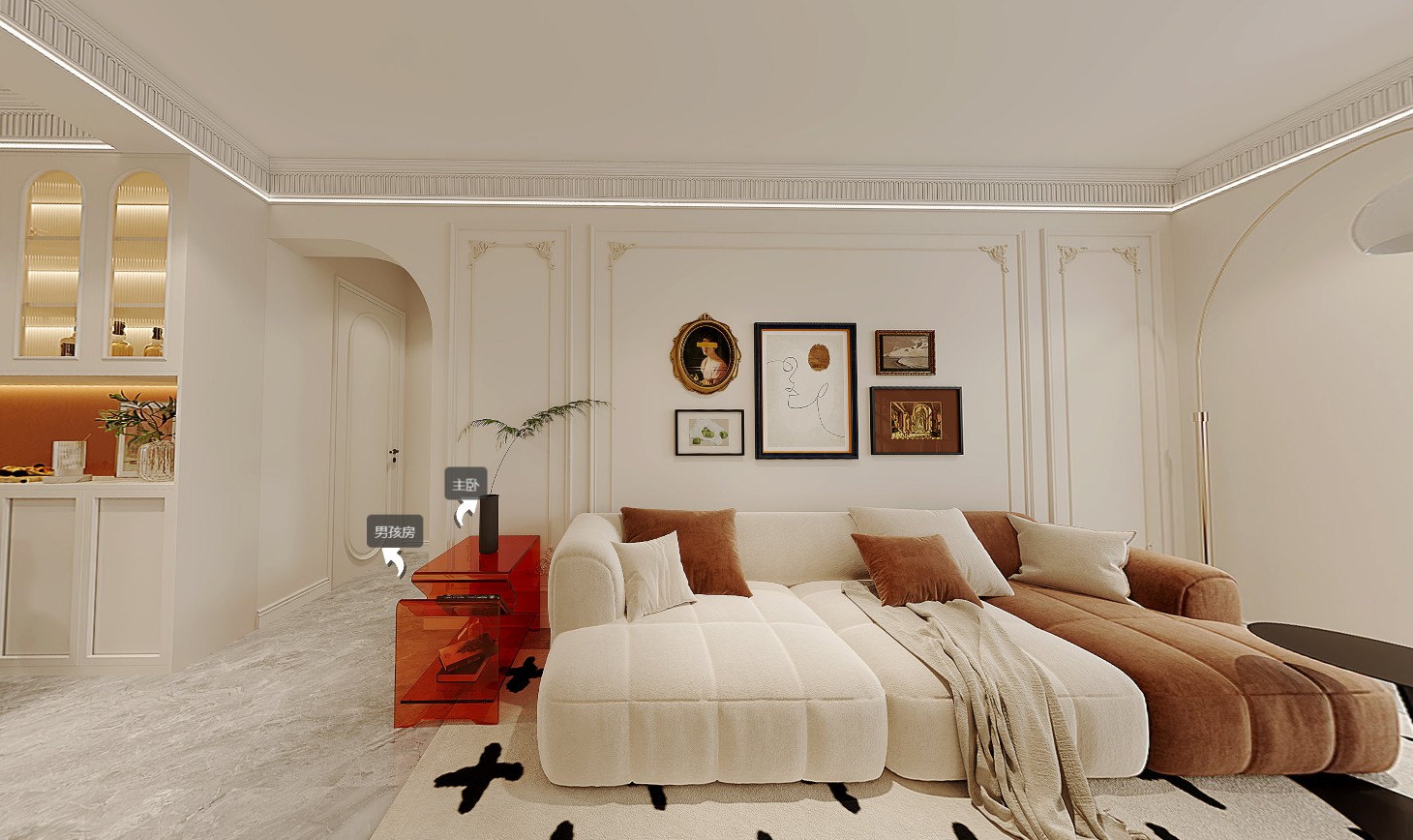 大面积的奶油底色让空间充满梦幻色彩,低饱和度的沙发地毯在阳光的倾照下柔软温和,不同层次的工艺肌理和软装饰品的层层叠加,细腻无声地塑造出空间的城堡主基调,赋予室内充满悸动的生命力。