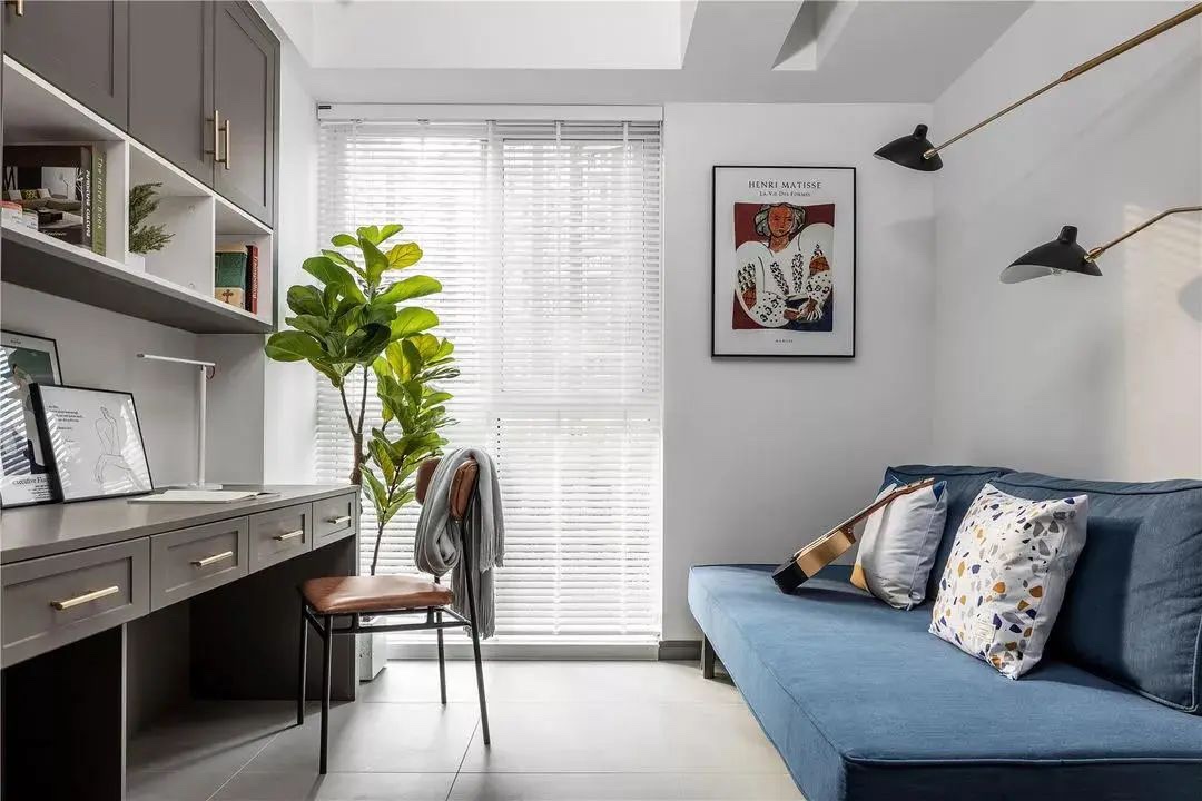 这个空间设计得非常智能,可以根据不同的需求灵活切换。最常见的形态是将客厅和书房合二为一,这样可以方便地处理一些工作和娱乐事项。