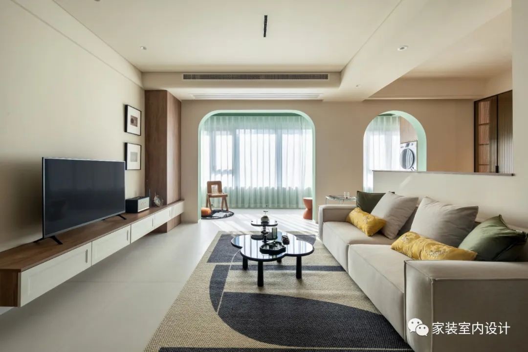 客厅选择大双人位的布艺沙发,法式奶油系的个性茶几,橡木色一体的电视柜和边柜,搭配了象牙色抽屉。