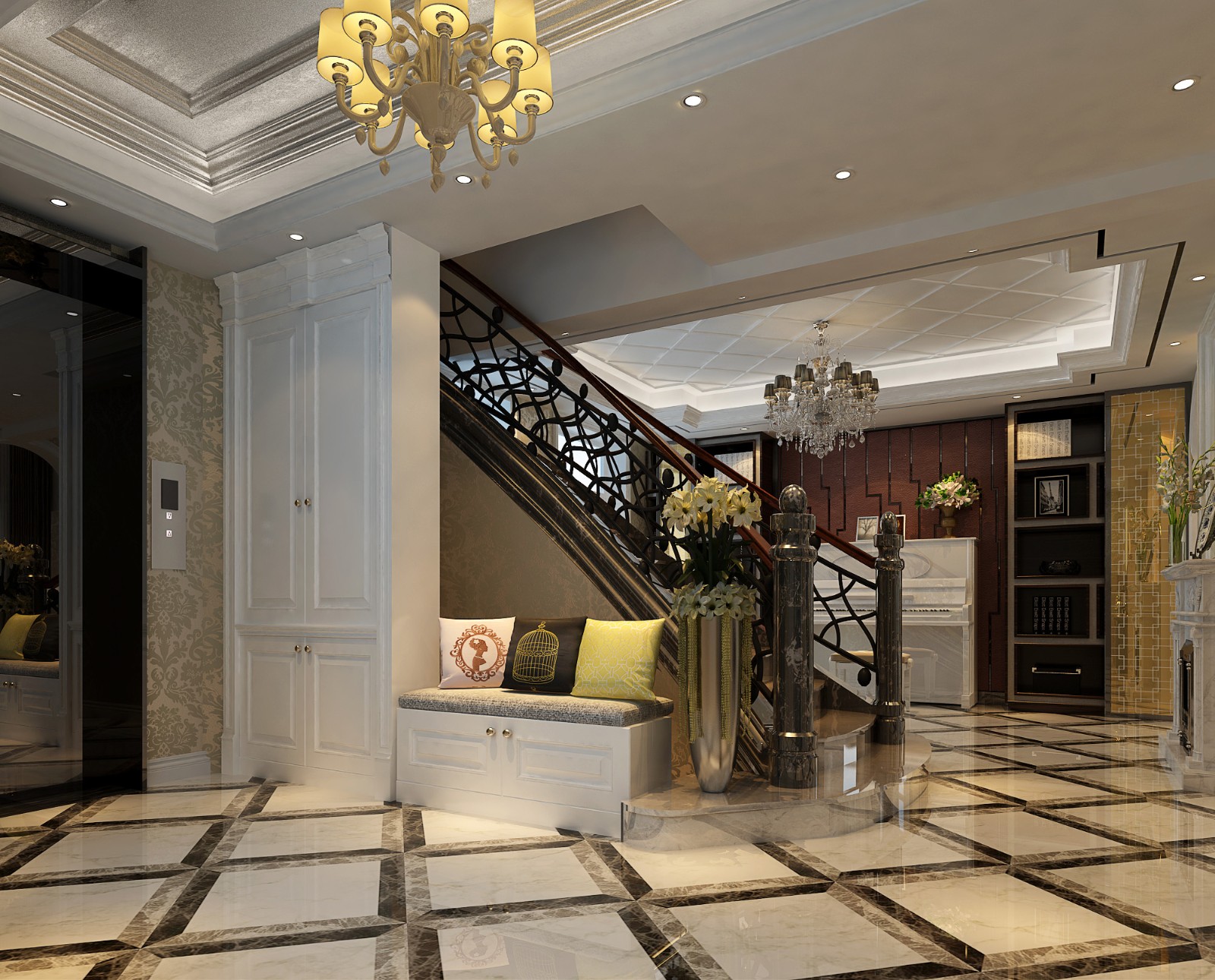 此空间展示的为门厅空间,搭配壁炉设计更凸显空间层次感