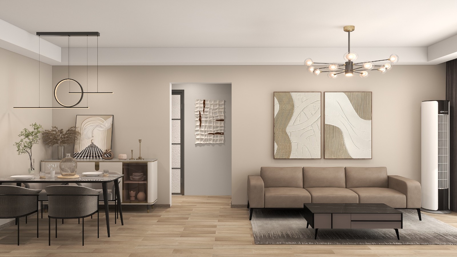 客厅沙发背景墙采用暖灰作为配色,颜色沉稳。