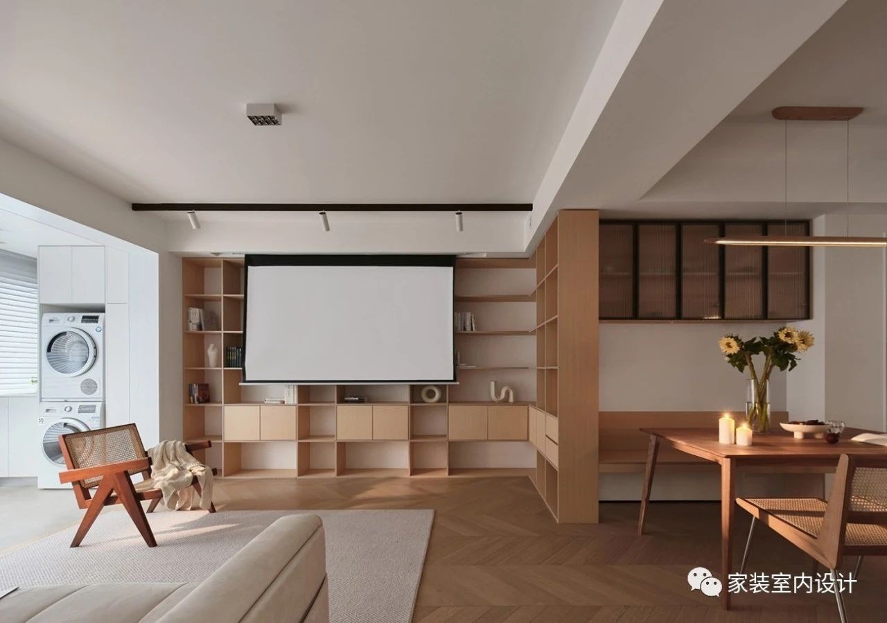 沙发背景的处理非常克制,纯白的底上被破开一道光的缺口,不会太过平淡无趣,也有效中和了书墙带来的繁复感,获得轻盈和放松。