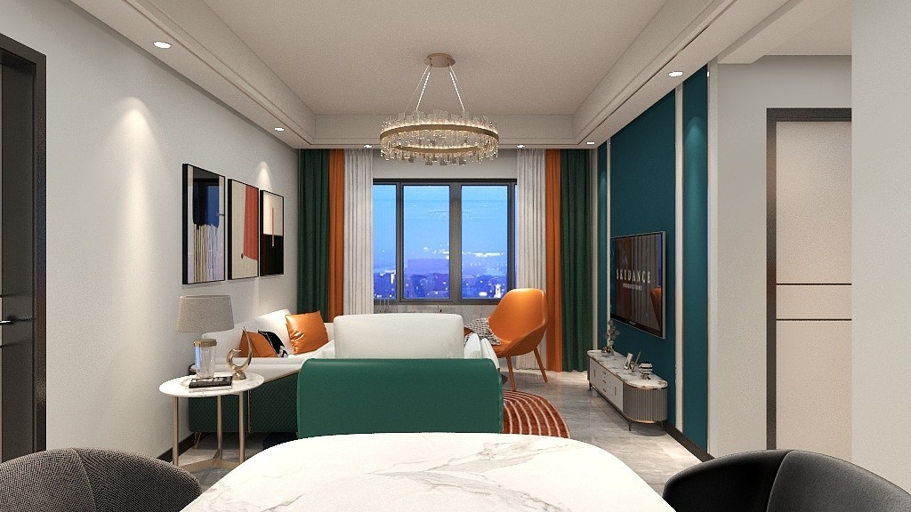 顶部在客厅区域进行暗藏筒灯处理,以双眼皮线条收边,增加空间层次感的同时做了巧妙的区域划分。
