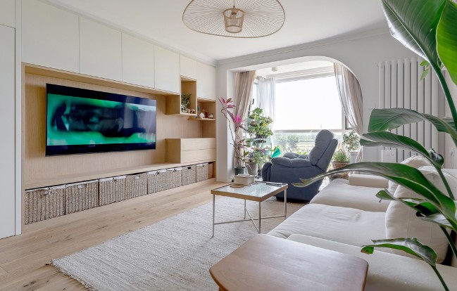 客厅的色调整体采用原木+白以及米色,充分的表现了北欧风格特有的素雅和温馨。带有结疤的地板,搭上亚麻材质的地毯,有种把大自然的元素引入了生活的感觉。