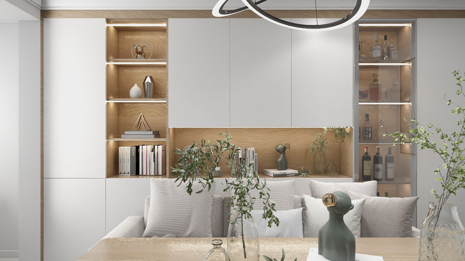客厅沙发背景采用定制书柜和酒柜一体,既保证美观又满足收纳的空间。整体颜色以白色为准,穿插木本色搭配相得益彰。