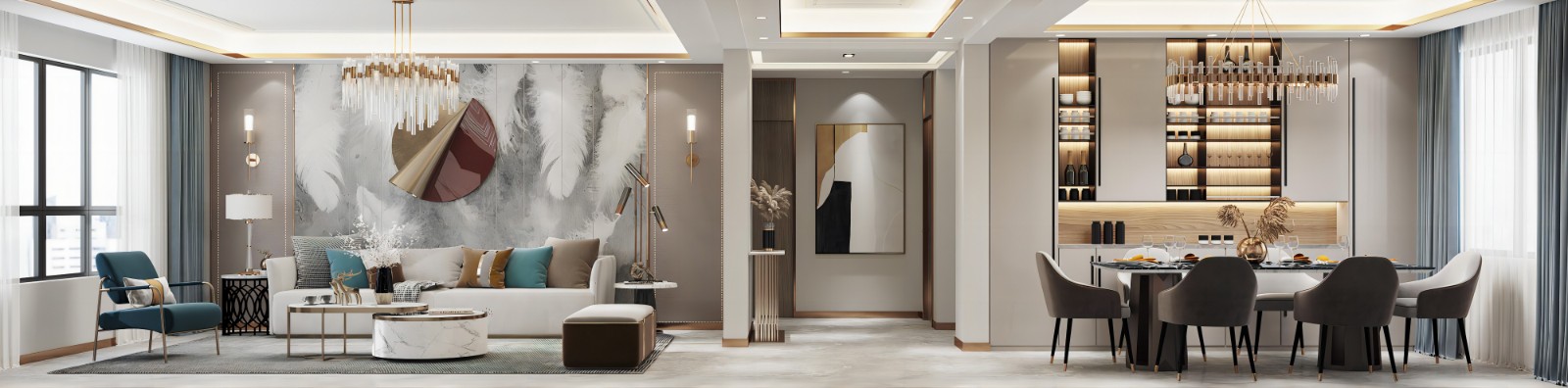 客厅整体效果,整体采用金属线条和皮革硬包的处理方式