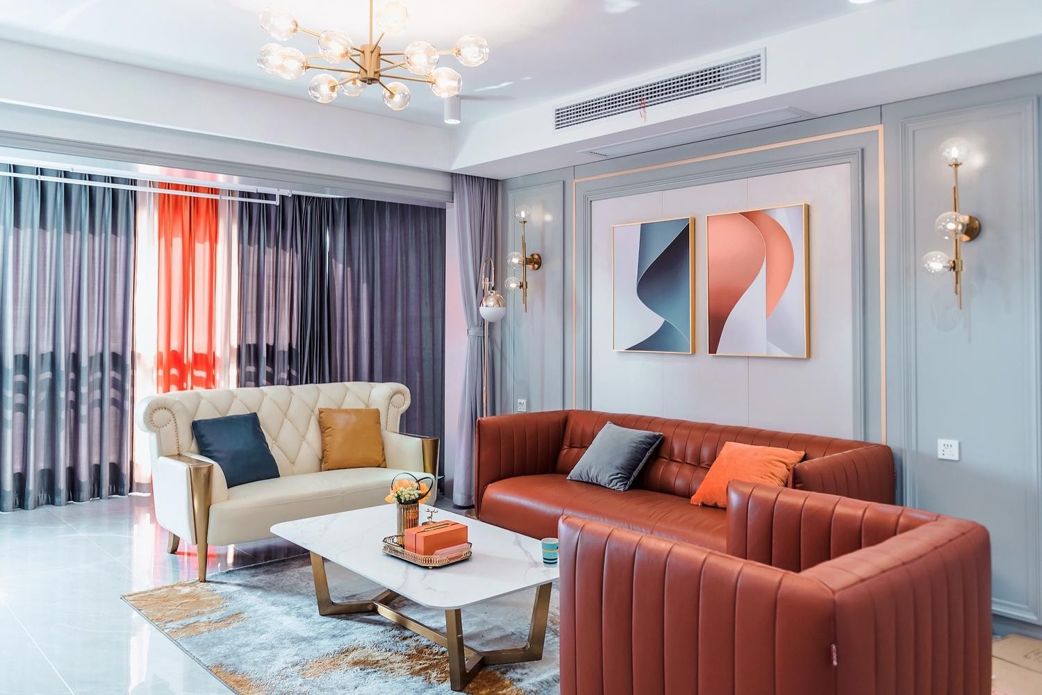 客厅阳台一体化格局,带来开阔敞亮的视觉效果,自在轻松的氛围由眼睛传递至身心,橙色大面积的运用,让整个空间视觉更加的迷人,让人***眼就惊艳,天花部分增加了筒灯也是对空间灯光的加强也是一种点缀。