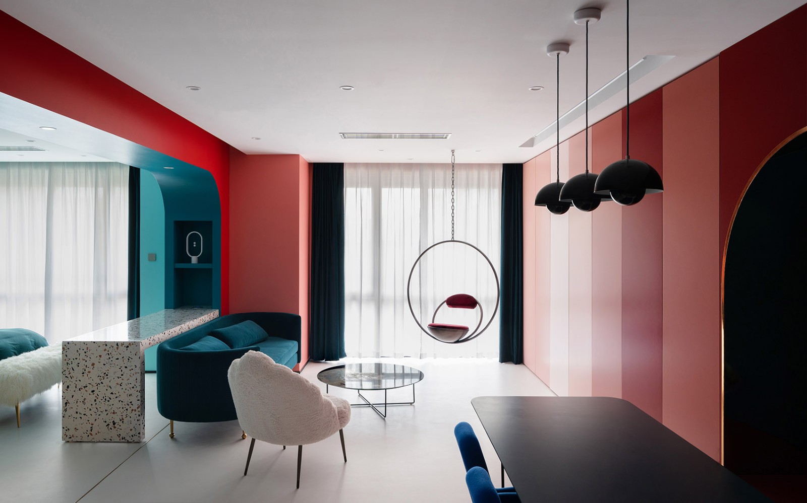 大胆的配色,使其墙面出来了由深到浅,又暖到冷