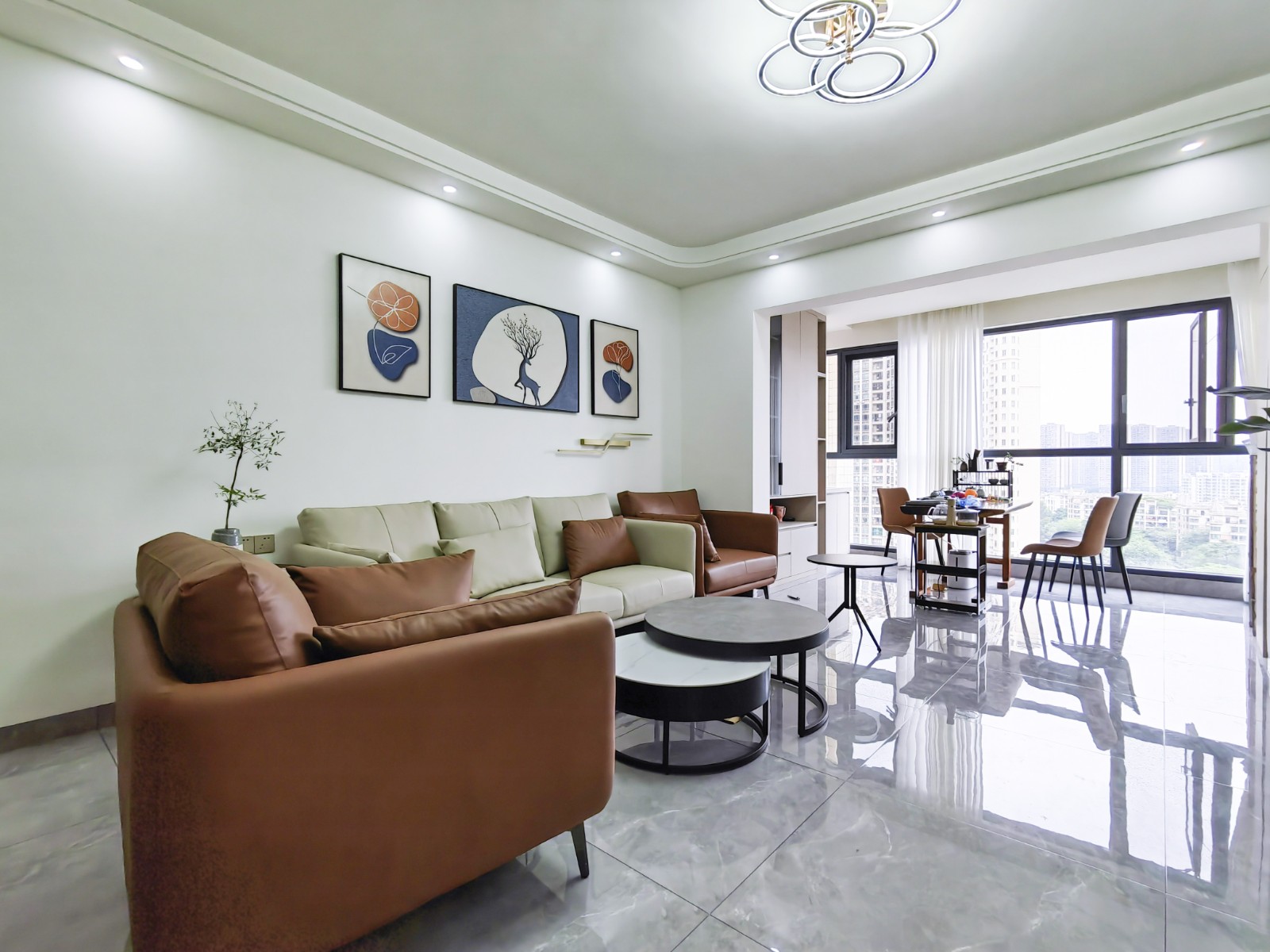 在软装搭配上,咖色的沙发和奶白色的沙发,完美融入整体设计风格。