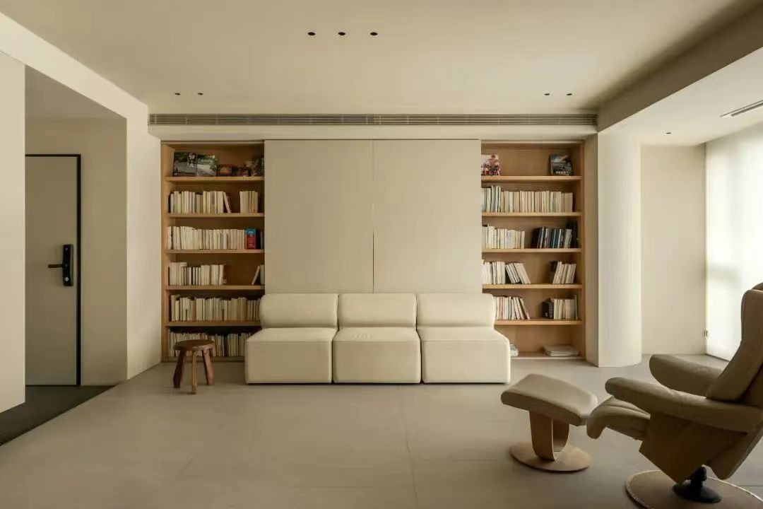 书架结合电视的设计,模块多样的沙发摆放形式,将休闲看书与观影模式巧妙结合起来。
