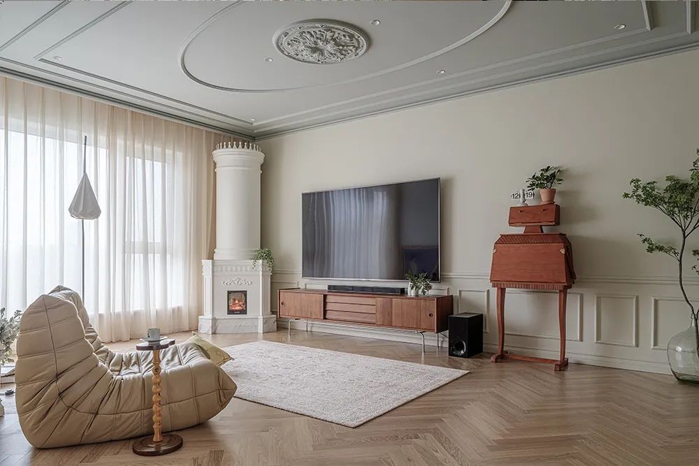 客厅故意而为之的无主灯设计,尽可能的释放了层高。装饰灯盘下,没有臃肿的多人位沙发,仅铺了一张地毯,一方面留足了毛孩自由奔跑的场地,一方面也便于清洁打理。