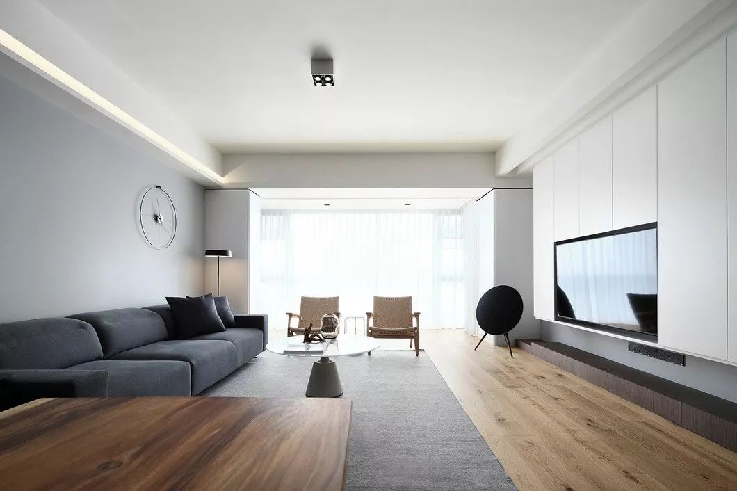 客厅的落地窗承接了阳光的洗礼,以“白灰木”的全屋搭色,让客厅空间看起来宽敞明亮之余,更添宁静雅致的休憩氛围,结束的繁忙工作后回到家里,情绪也随之被安抚舒展。