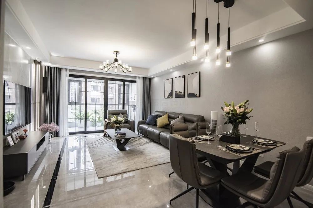 灰色的皮质沙发与大理石材质的茶几,挂画与抱枕一抹黄色是点睛之笔,打破了空间的沉闷感,在寂静之余带来一抹灿烂的喘息。沙发背后的光源用来减少暗颜色的沉重感。
