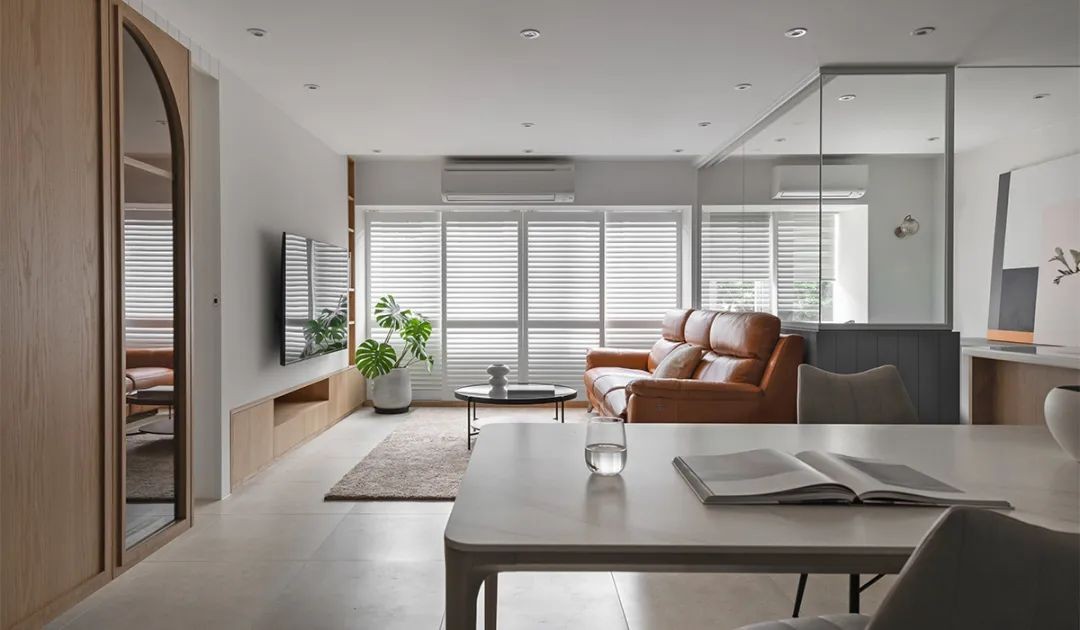 随着圆弧转角引领 莱姆石地板则连绵揭开一幅沉静光景 而一座悬浮木质收纳柜承接朴实调性,推开家的主墙 电视墙也在半弧端景的呼应之下 以镶嵌木柜跃出视线,满足客厅收纳需求