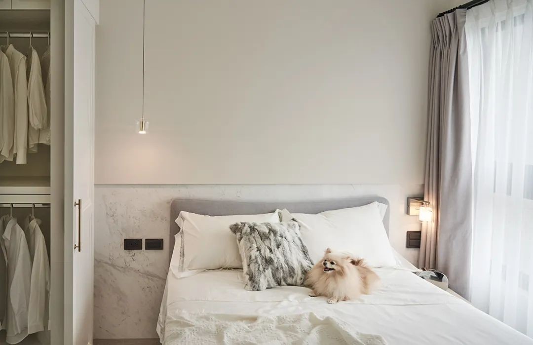 进入卧房时,天花的倒弧勾勒为睡眠区抛出了相对开阔感 银狐白大理石则接续铺展出床头亮点 为使维护不着费力,床头在120 公分高之上外推出段差 让珪藻土接手展开屋高、缓解屋内湿气
