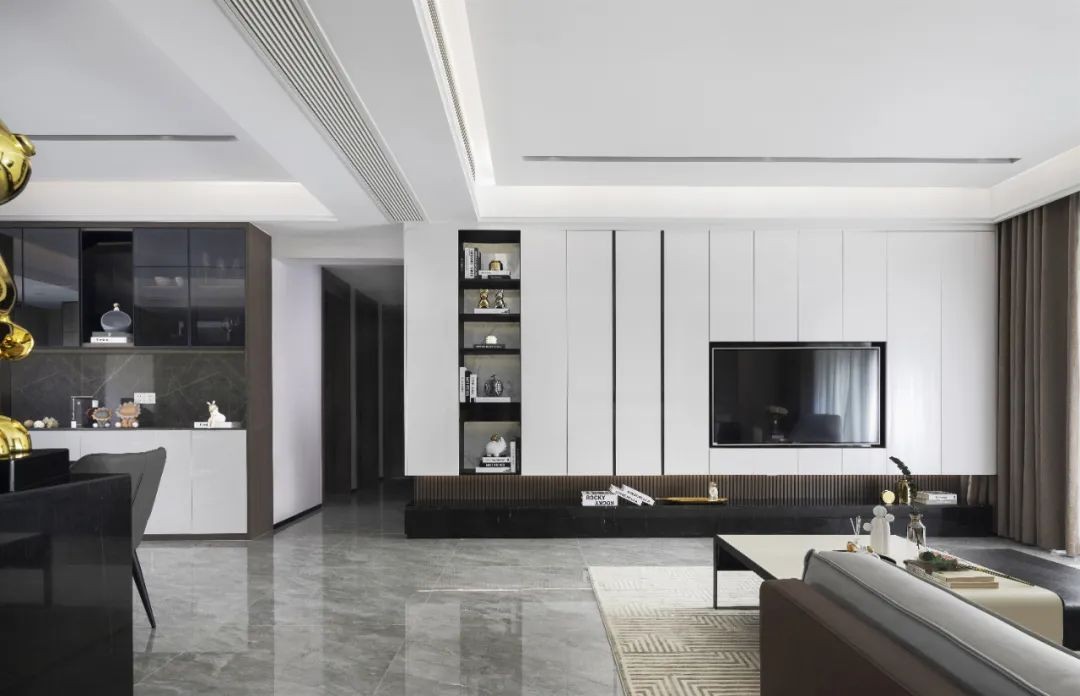 通排的柜体带来稳重的视觉效果,既作为生活品位的展示,又确保收纳的井然有序。而金属家具则带有几分亮点的点缀,与带有木质的柜体搭配,中和过分的厚重感,增添一丝时尚感和精致气息。