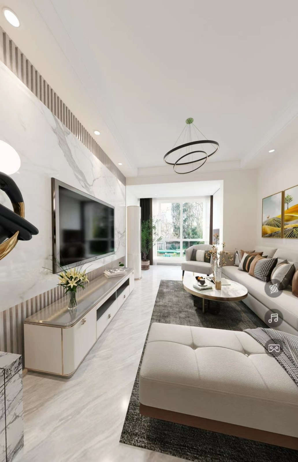 客厅电视墙做了格栅,大理石贴面,阳台打通,使得客厅更宽敞明亮。