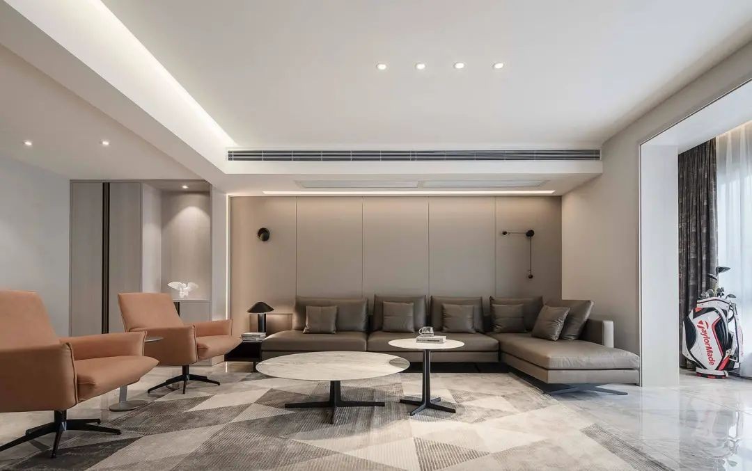 宽敞的客厅,天花吊平做无主灯的设计,电视墙是定制地台+硬包背景墙的设计,地毯下暗藏的灯带,电视墙硬包造型上方对应的筒灯,还有藏在天花里的灯带,都让空间显得更加简洁优雅。