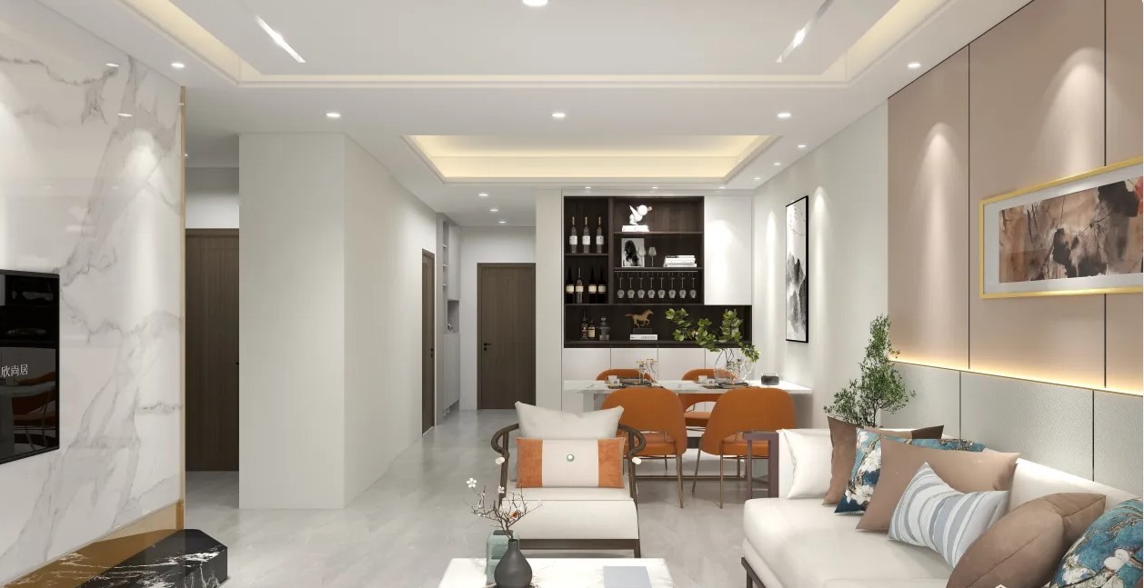 整体的无主灯吊顶设计,石材电视背景墙与木饰面沙发背景墙