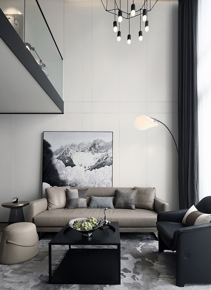 loft空间开敞而灵动,采用黑白灰色为基调,大面积白色烤漆背景墙面与灰橡木地面搭配,简约大方