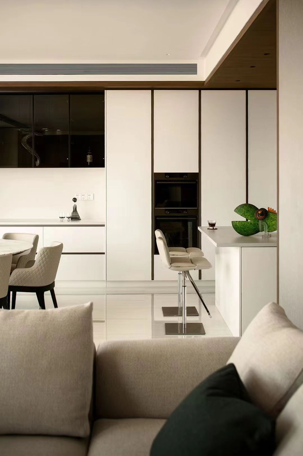 圆桌与紧邻厨房的长方形吧台,融合东西方生活方式。在这里,可以随时切换进日咖夜酒的休闲模式。