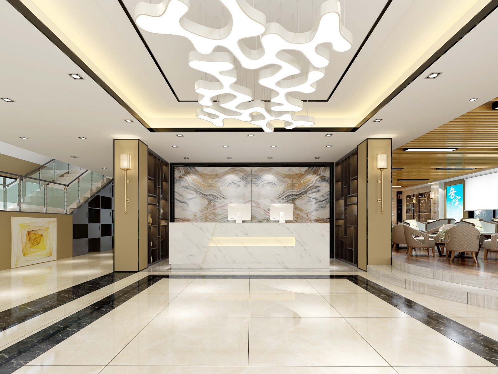 占地面积约1000平方,功能划分:前台区、综合接待区、员工区、总经理室、总监室、人事部、财务部等区域。风格以后现代为主,配以光泽明亮的材质,如不锈钢、通体抛釉砖等。