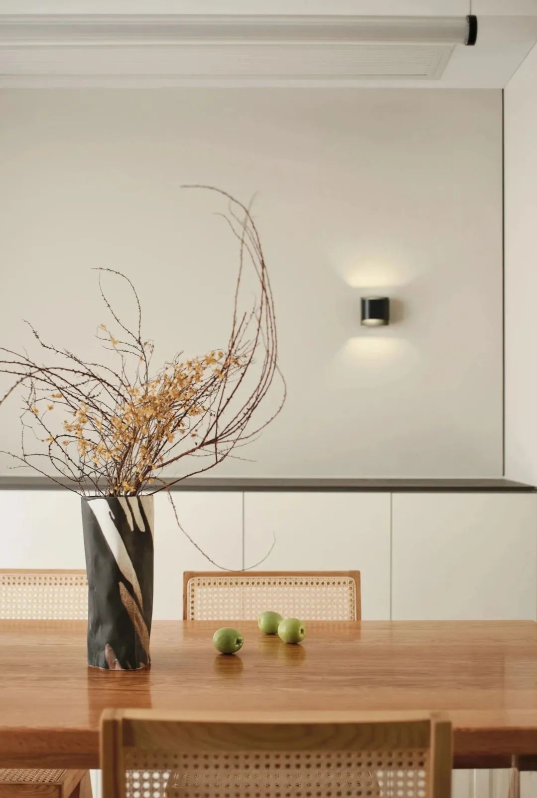 餐桌的选择也秉承简的要素,亚克力让餐桌也有悬浮感,美的让人不易察觉。