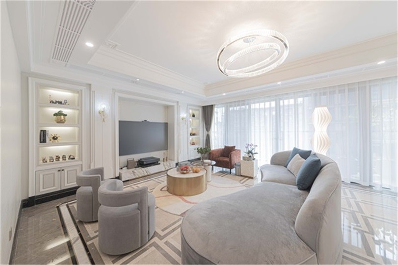 客厅安装双层吊顶压低层高,天花装石膏线装饰,因为没有做藏灯设计,客厅面积大,只有主灯会显得空间比较压抑,不通透,所以边吊上安装了筒灯加强整体光照,空间更加透亮。 地砖选用100×100cm的方砖,米色地砖边缘处加灰色边框,铺贴完成后砖与砖相互连接,纹路简单有有纹理,方正的造型使得空间的线条感和层次感都非常不错,透视感强。