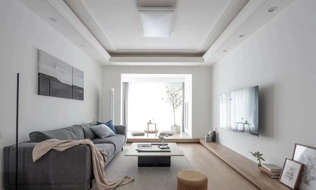 本案是一个80平的三居室,整体以线性灯具结合植物点缀空间。